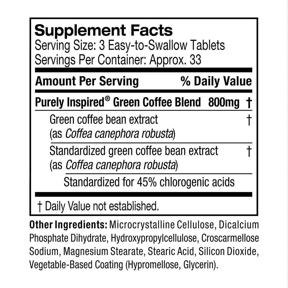 Green Coffee+ của Purely Inspired cung cấp 800 mg cà phê xanh mỗi khẩu phần, bao gồm 200mg cà phê xanh chuẩn hóa cho 45% axit chlorogenic.